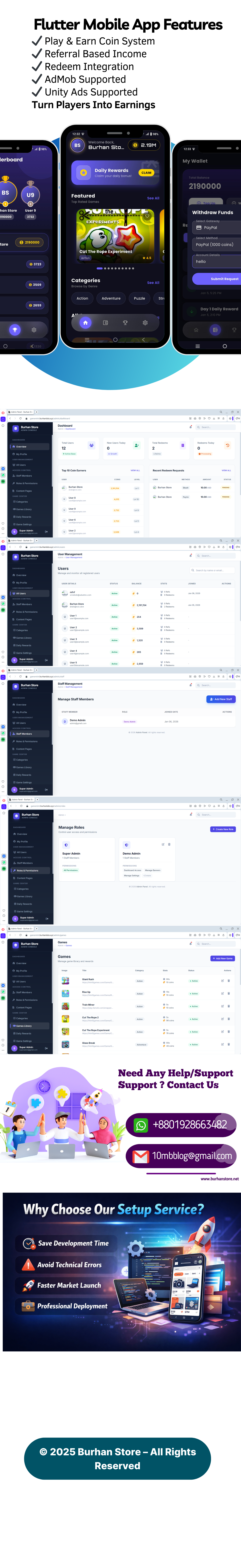 GameMint is a powerful Play-to-Earn HTML Game Platform developed using Flutter (Mobile App) and Laravel (Admin Panel). Admins can upload unlimited HTML5 games, and users can play games to earn coins, rewards, leaderboard rankings, and referral income.